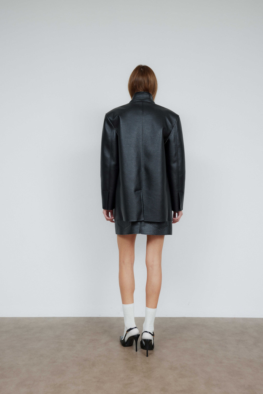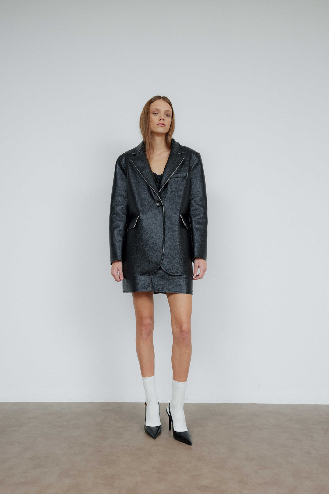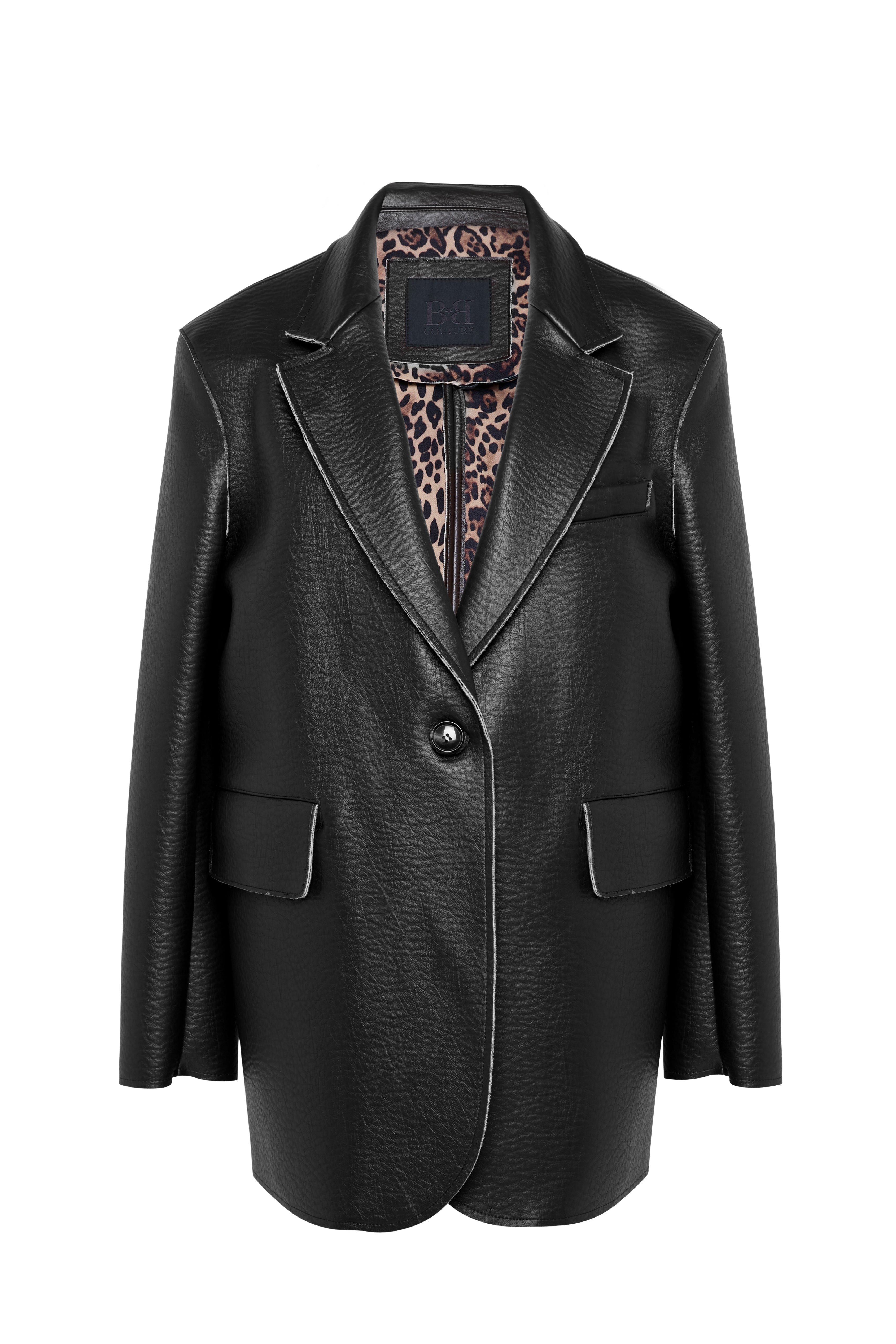 Blazer nero dal design moderno ed essenziale, ideale per completare look grintosi e sofisticati. La silhouette è definita da una linea pulita con chiusura frontale a un solo bottone, mentre le tasche con pattina aggiungono struttura e funzionalità. Lo spacchetto posteriore garantisce comfort e libertà nei movimenti. A rendere unico il capo è la fodera interna con stampa zebrata, un dettaglio inaspettato che dona carattere anche all’interno. La modella è alta 1.75 e indossa una taglia 42.