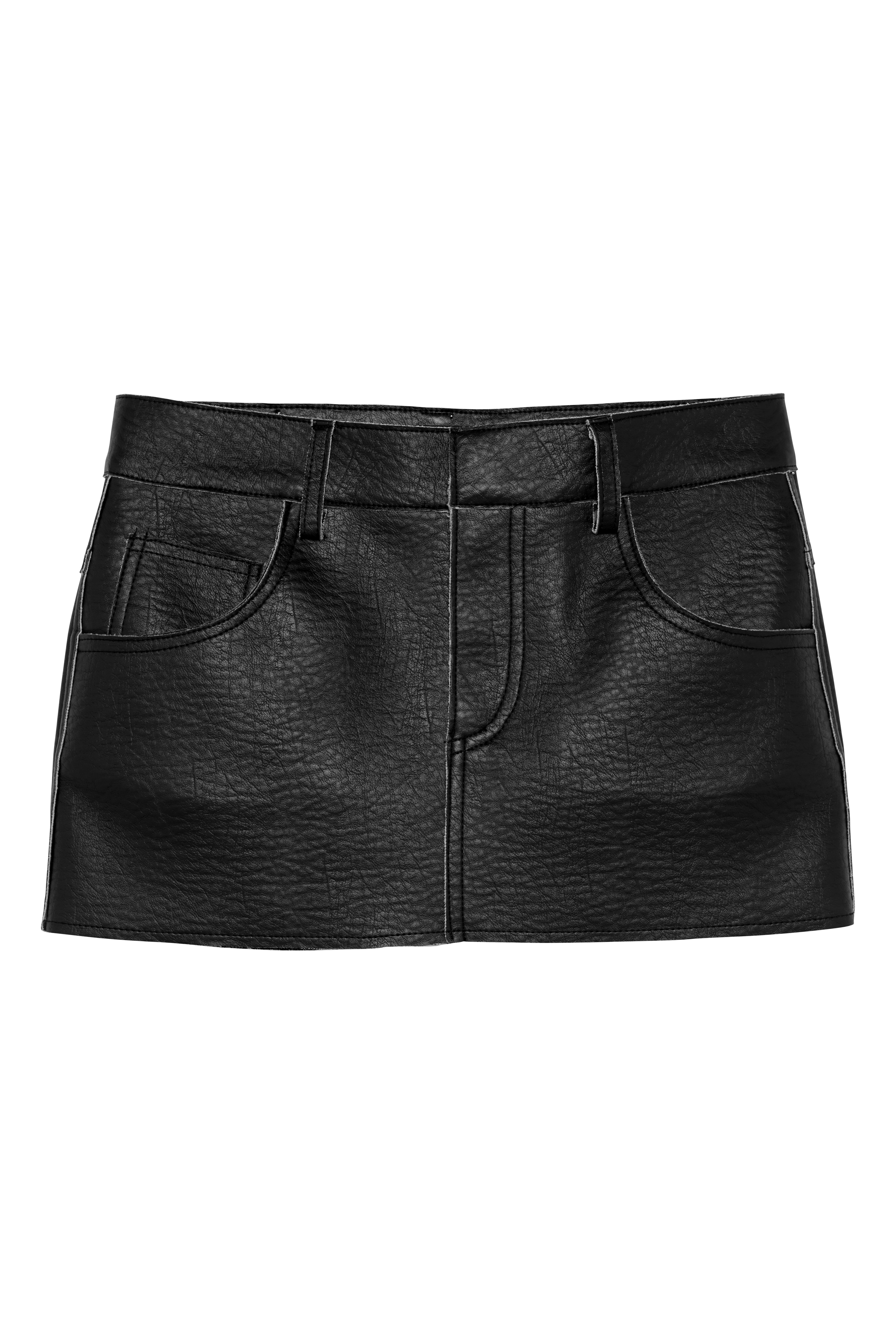 Minigonna nera in finta pelle dal carattere deciso, pensata per definire look contemporanei e versatili. Il design strutturato presenta quattro tasche funzionali e un taglio vivo che dona un tocco moderno e grintoso. La vita è arricchita da passanti, mentre la chiusura frontale con zip e bottone rivestito garantisce una vestibilità pratica e curata. La fodera interna con stampa zebrata aggiunge una nota inaspettata e distintiva.