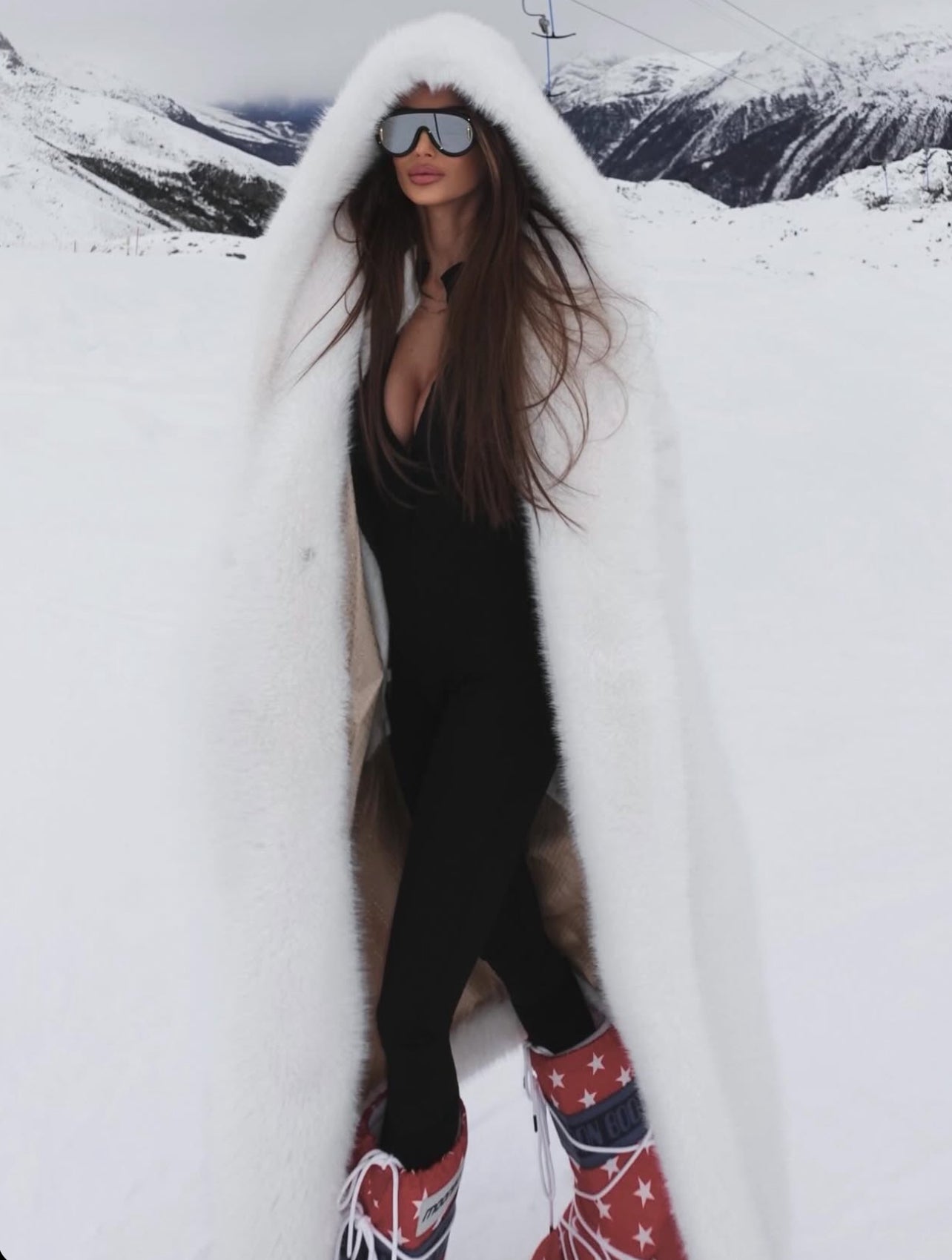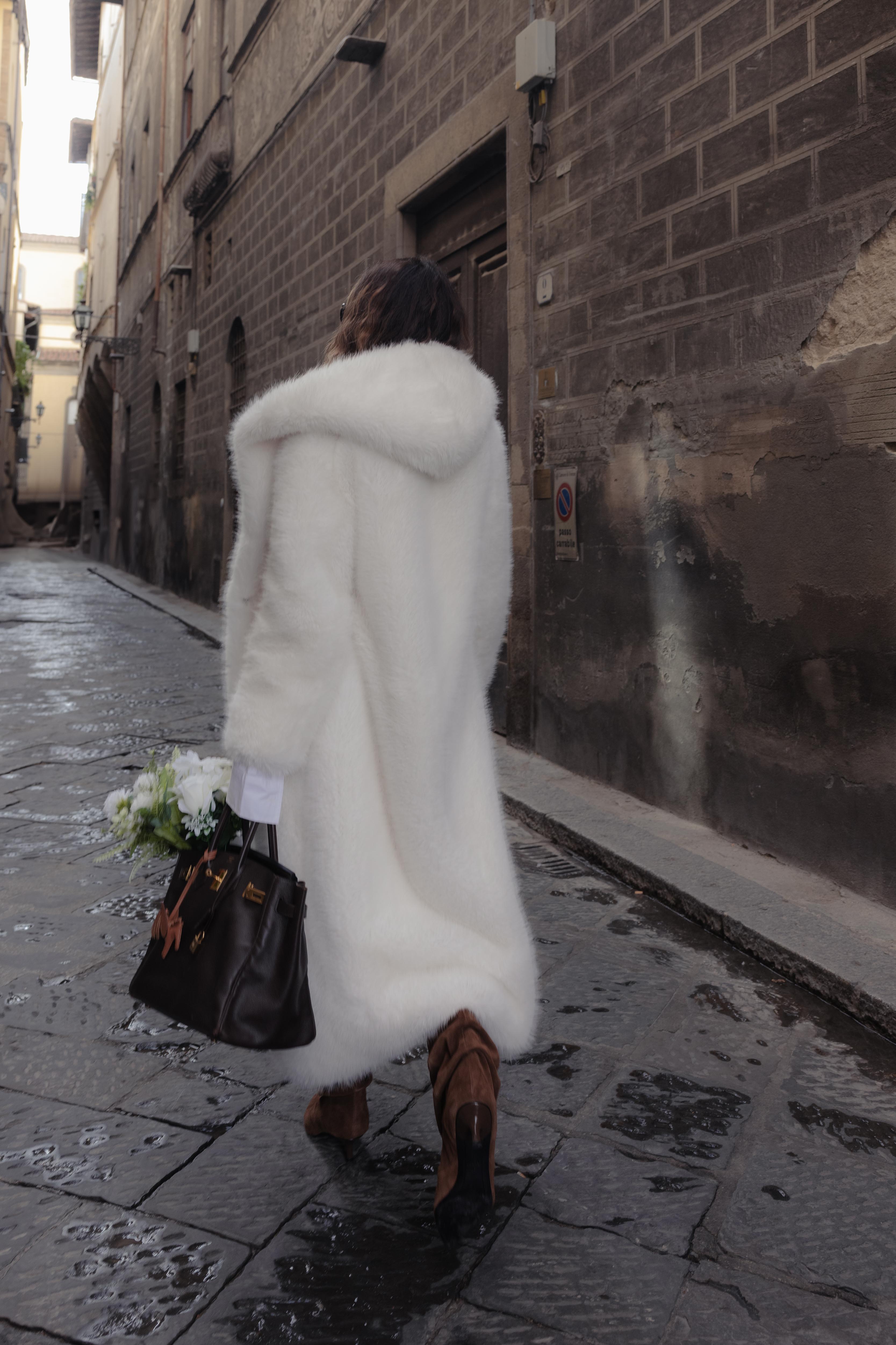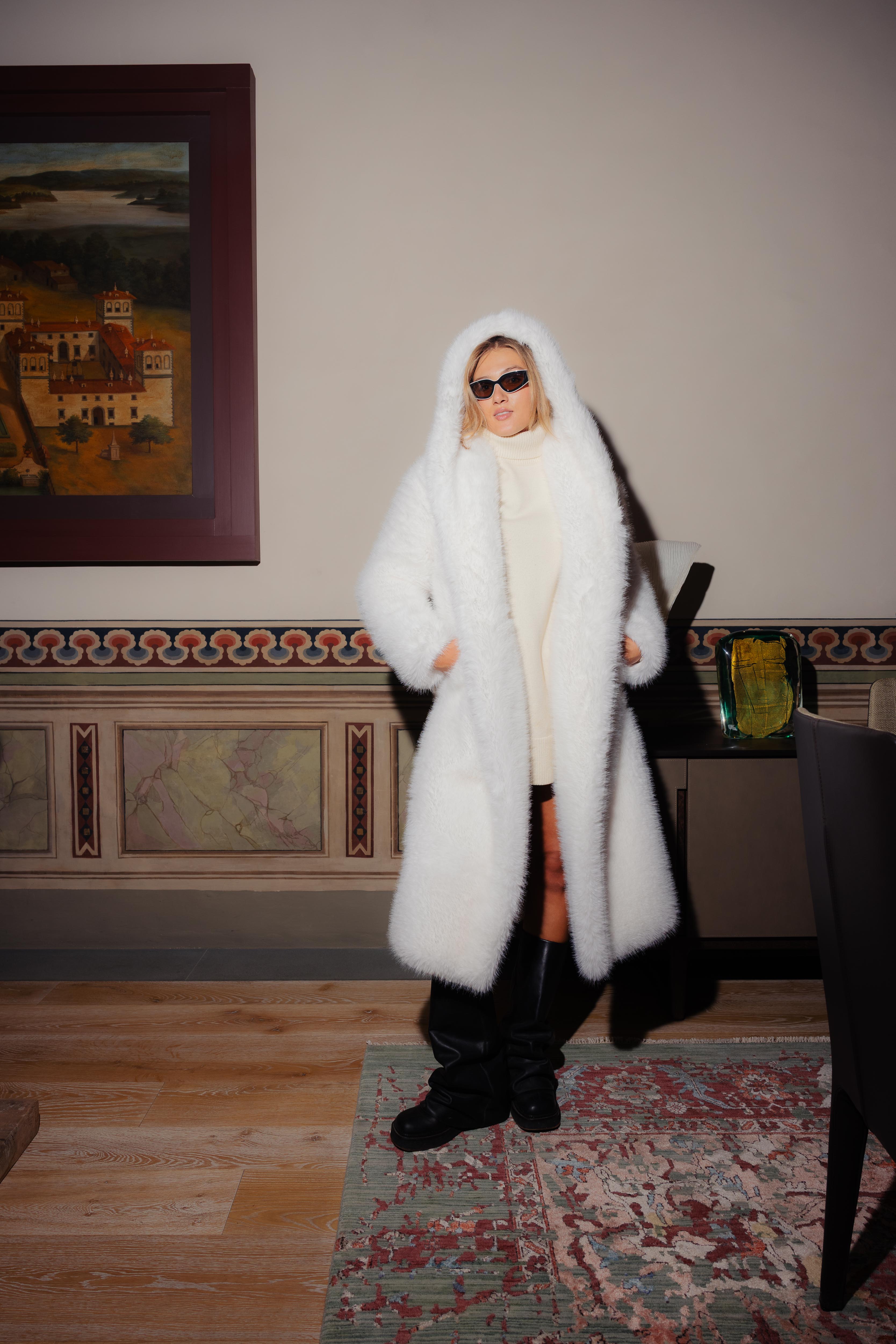 Cappotto in finta pelliccia bianca effetto visone, elegante e cruelty-free. Morbido e luminoso, dona un look sofisticato con una vestibilità regolare che valorizza ogni silhouette. L'ampio cappuccio unisce stile e praticità, mentre la chiusura con tre bottoni tono su tono mantiene un design pulito. Tasche a filo foderate in viscosa completano il capo con comfort e raffinatezza.