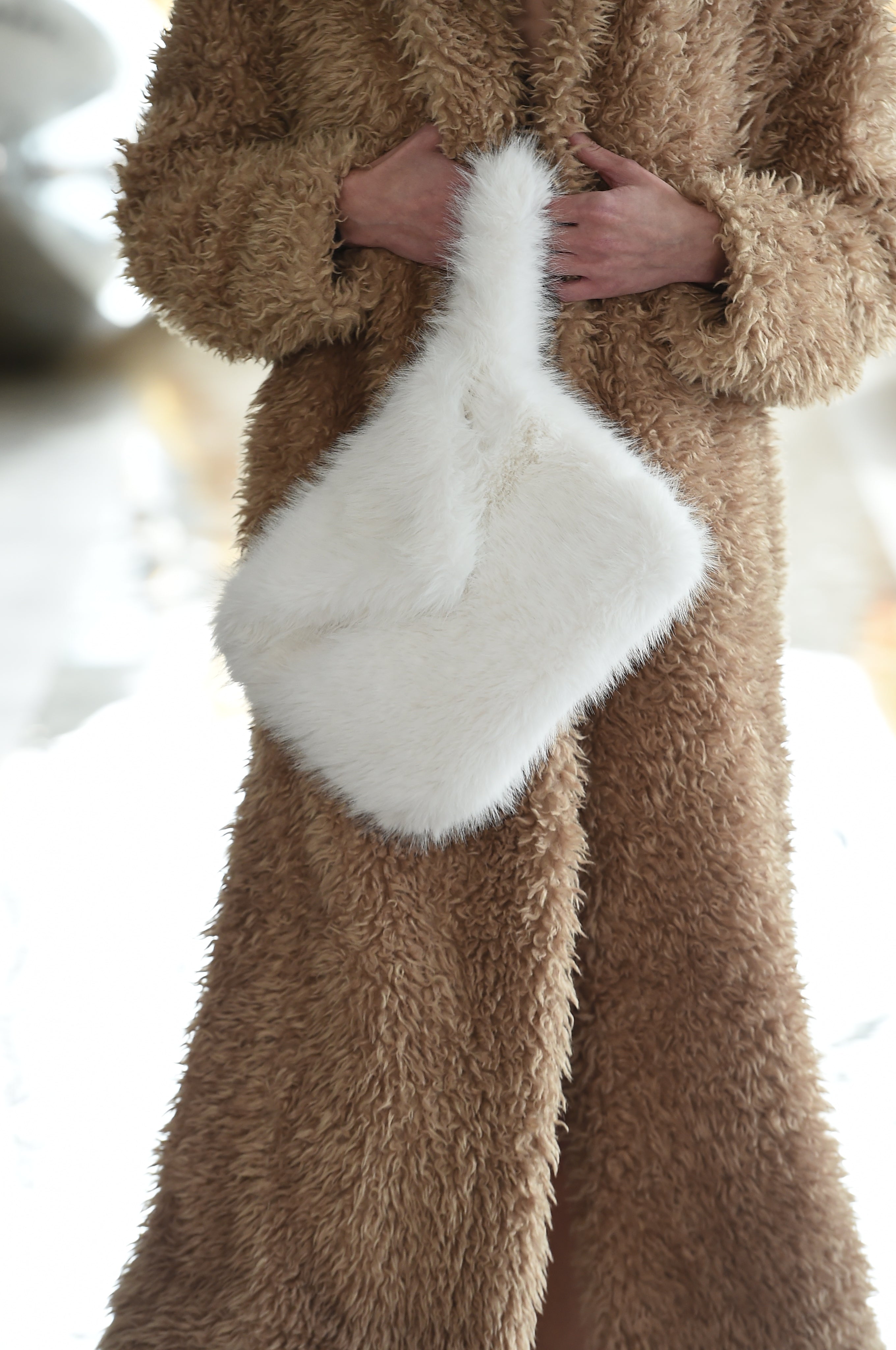 Cappotto lungo con spacchi laterali, effetto agnellino nei colori del beige con ampio cappuccio.