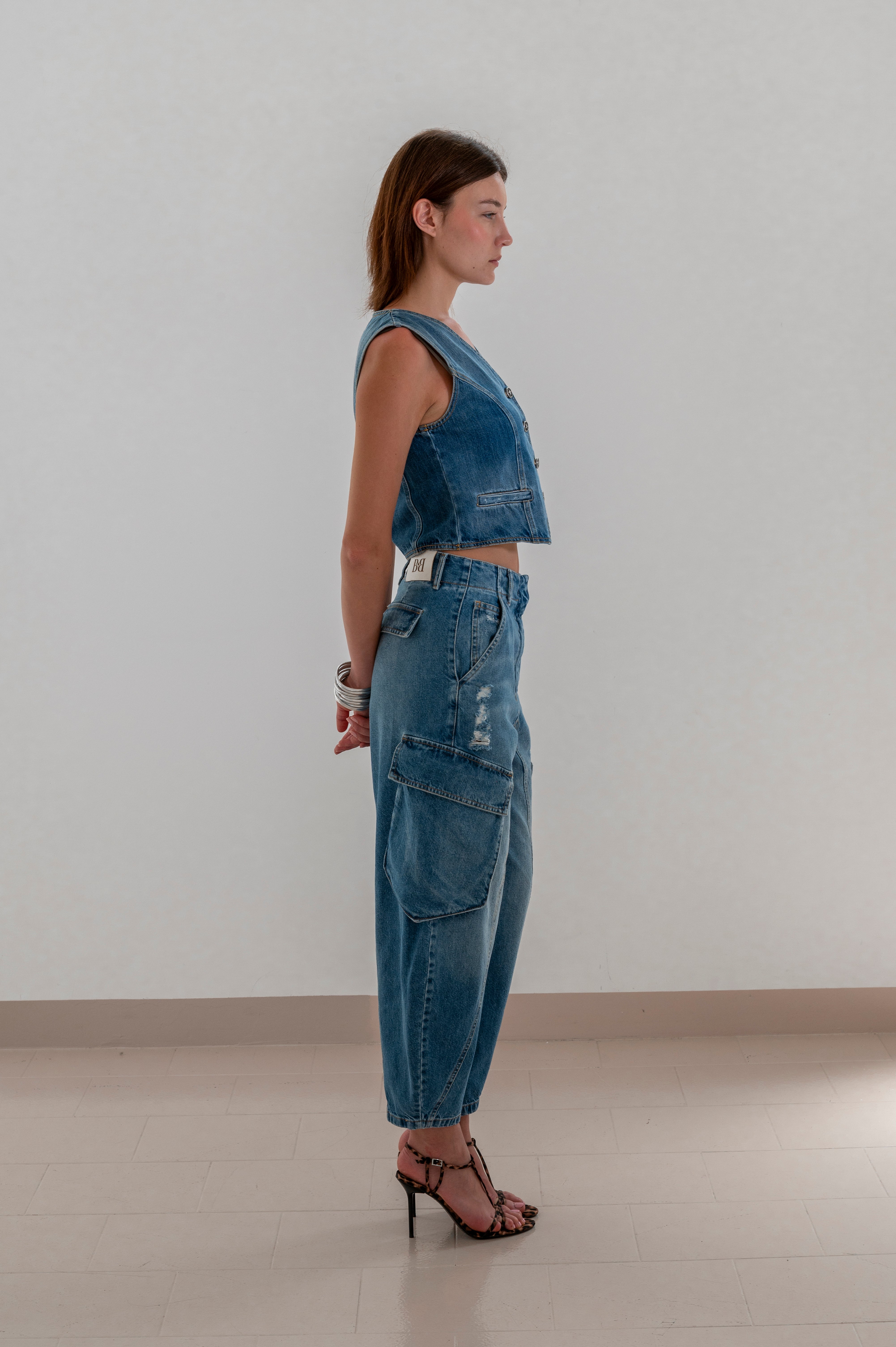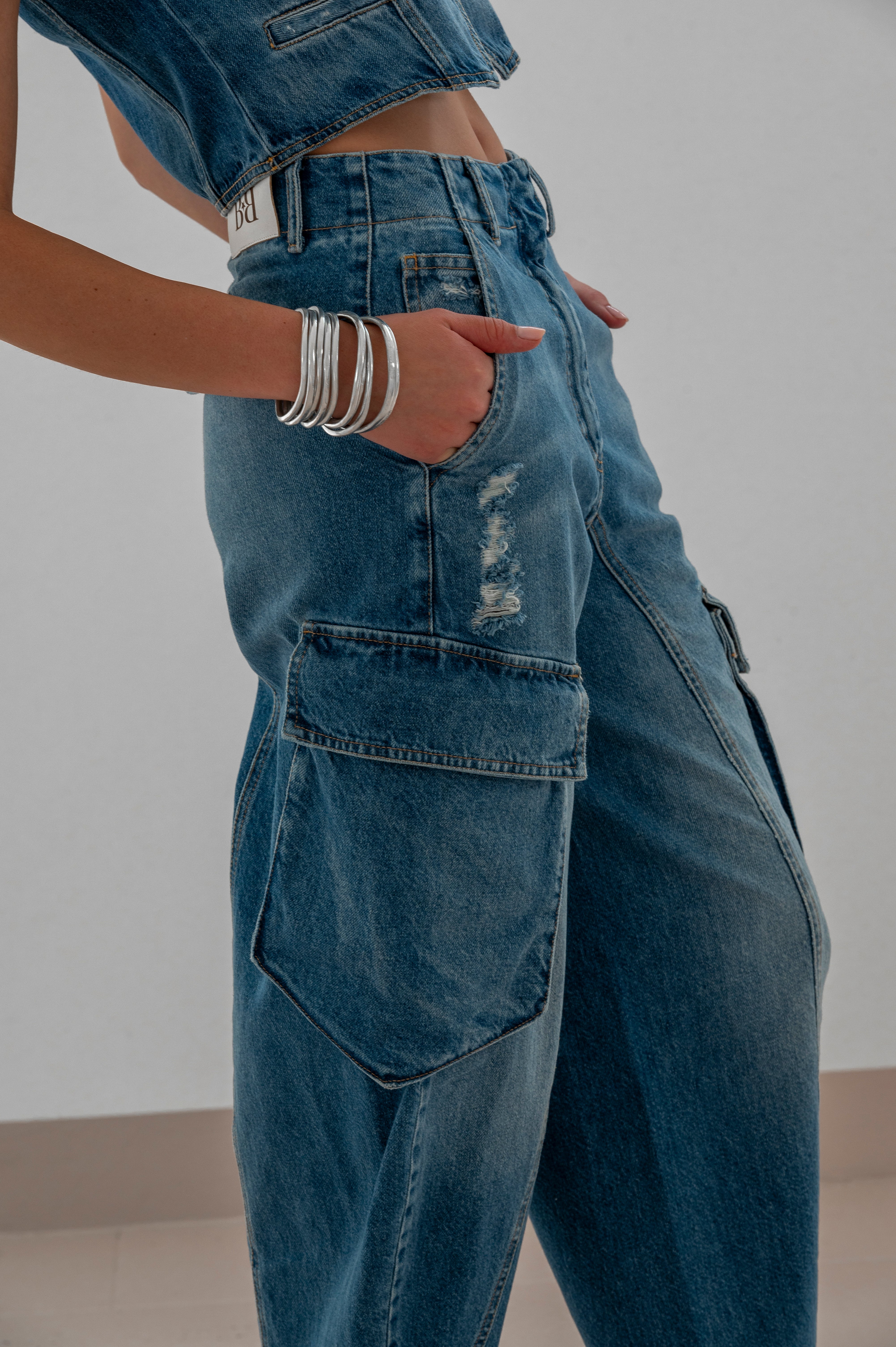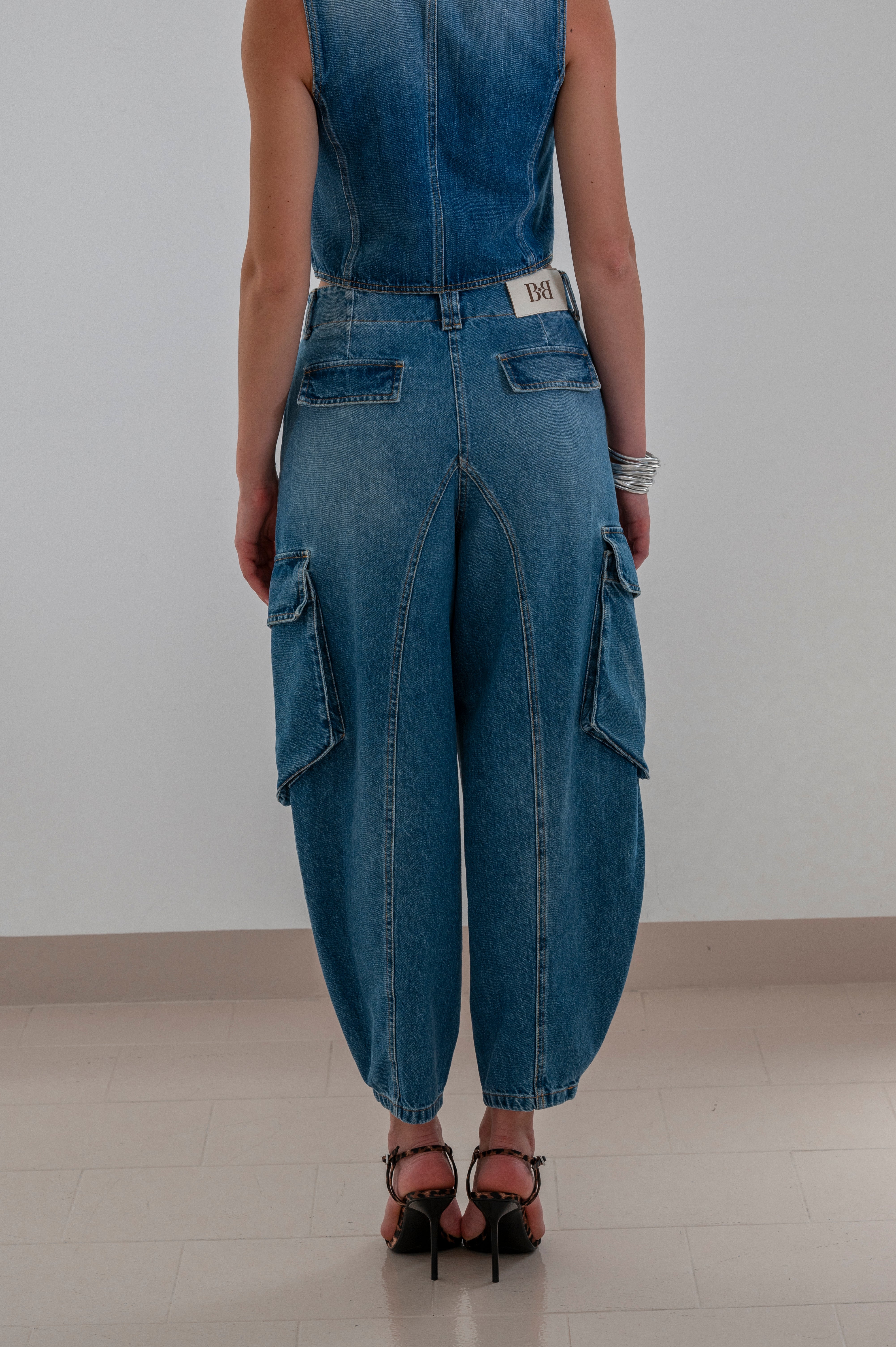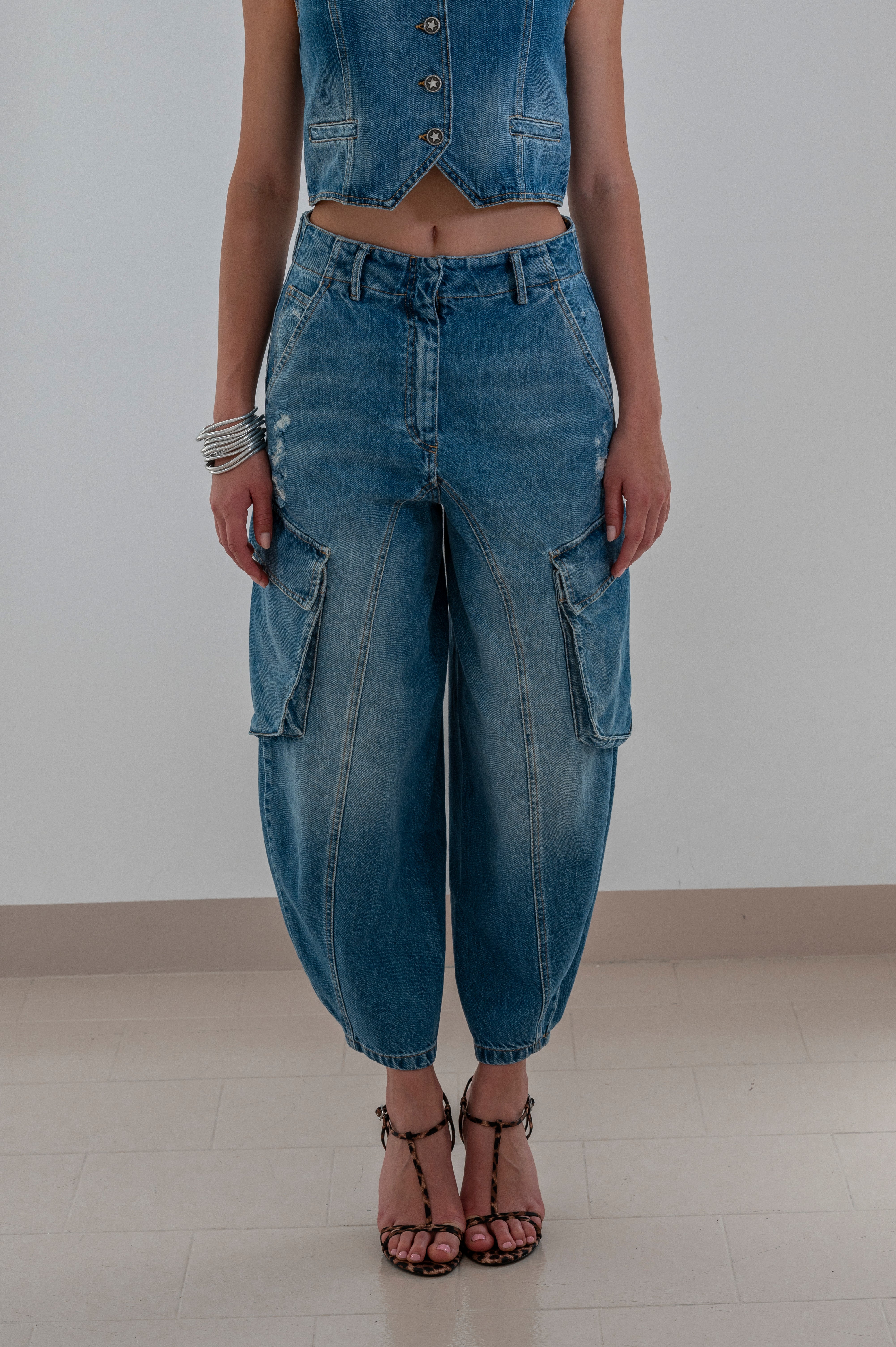 Design: Jeans cargo con 5 tasche e con tasconi laterali, lavaggio chiaro.