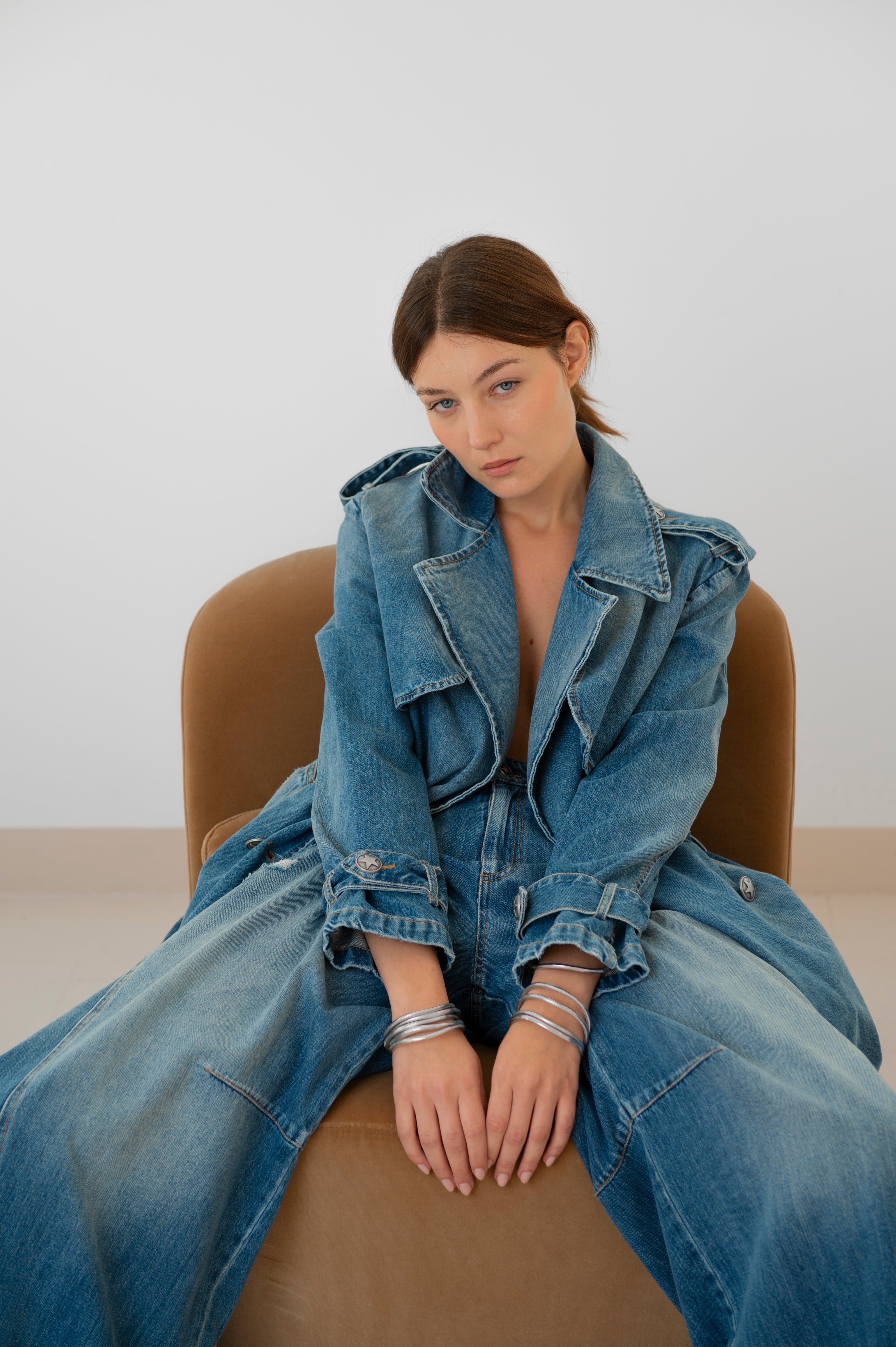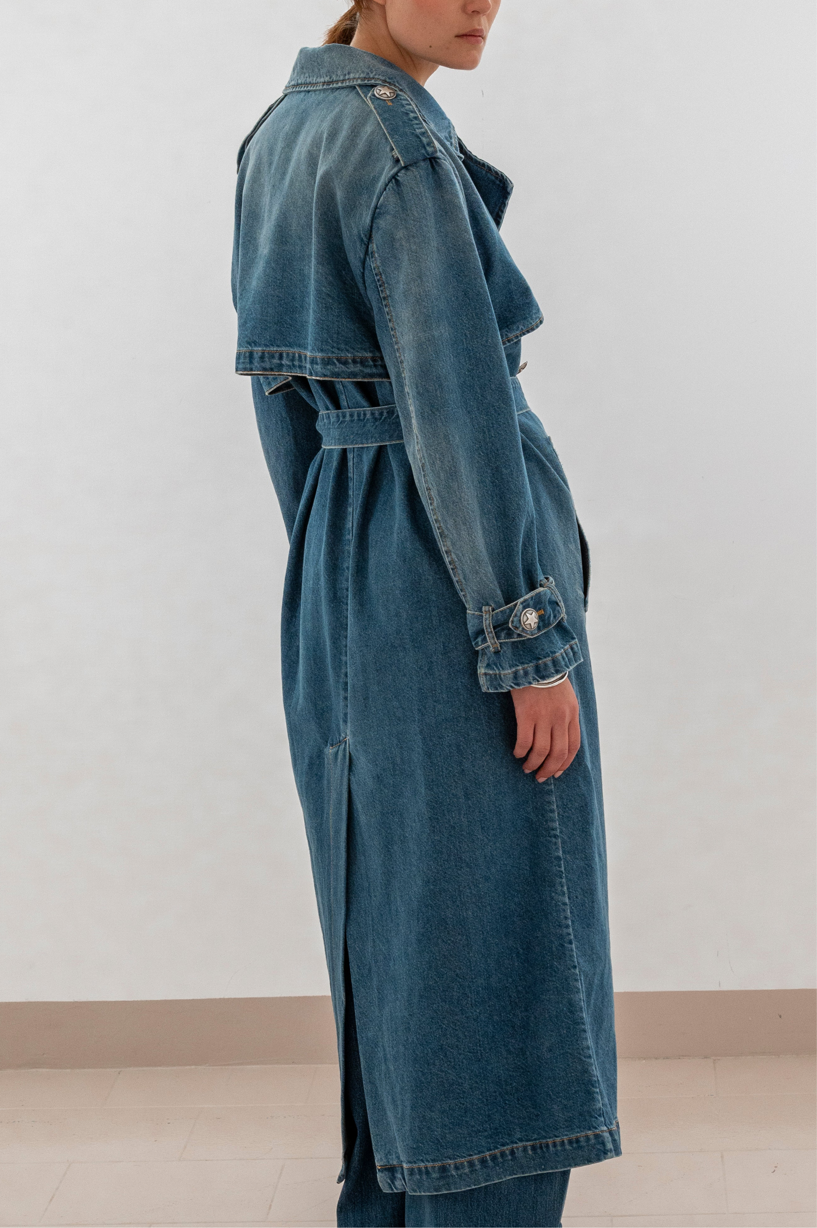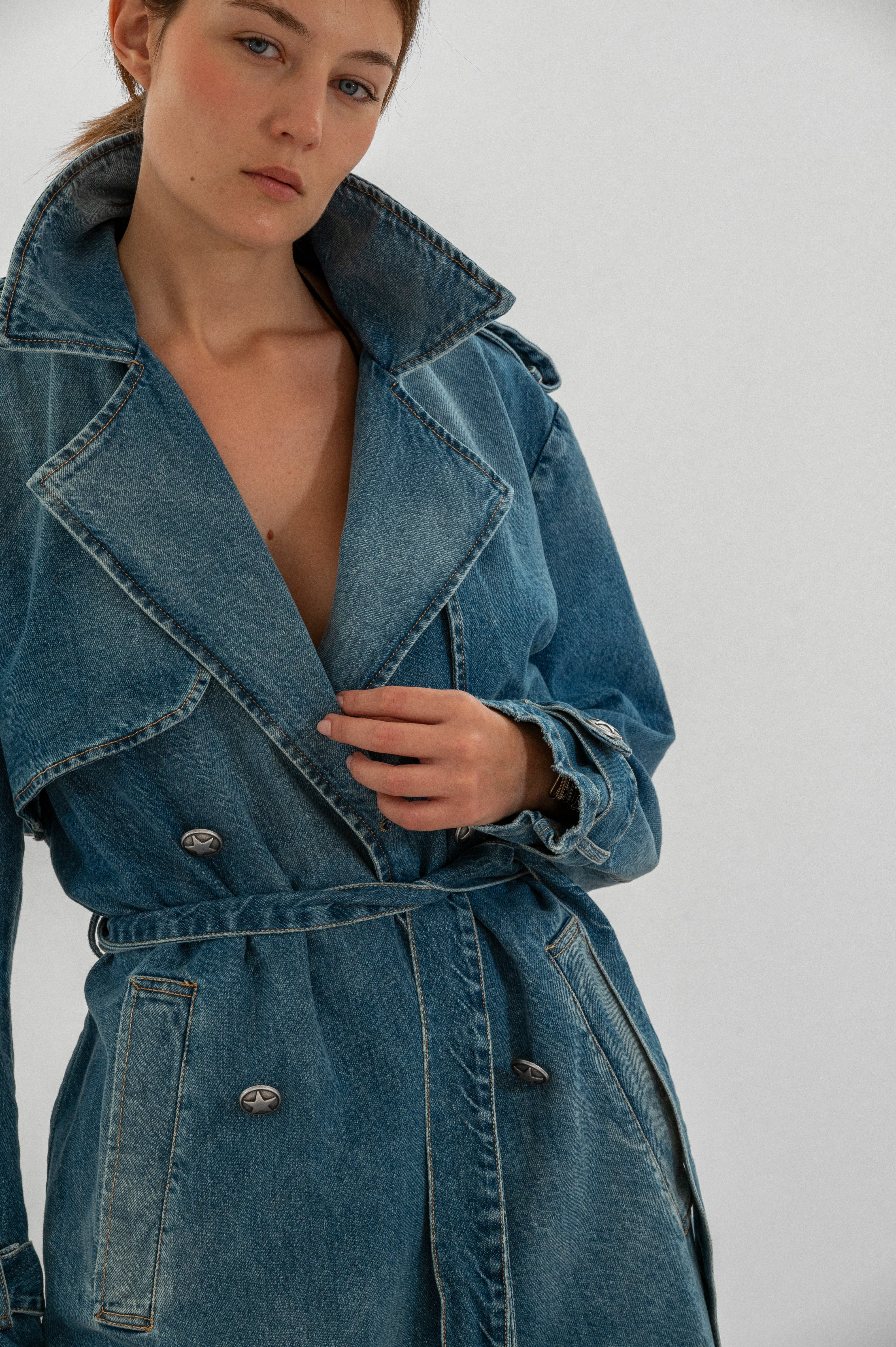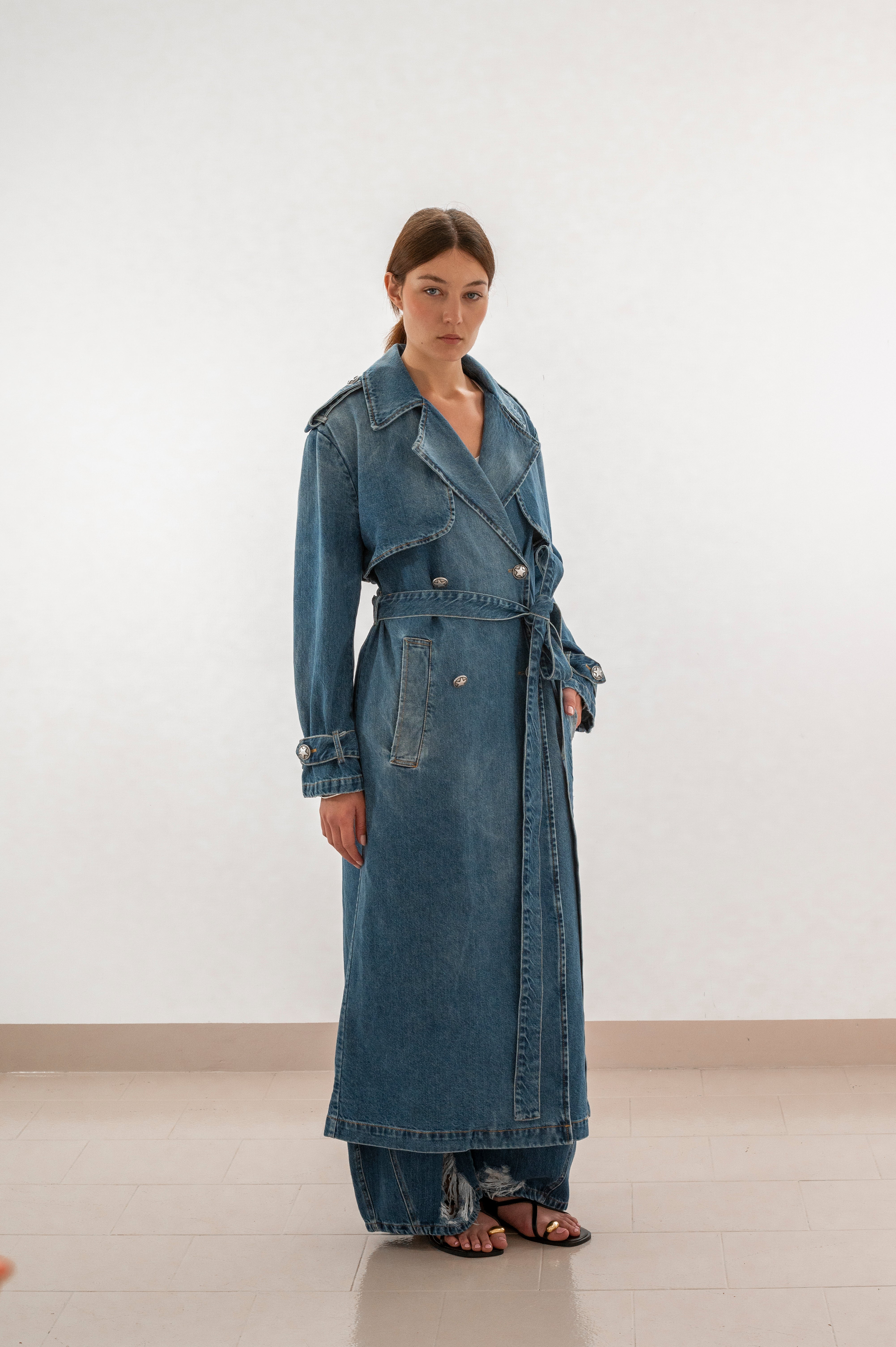 Realizzato in denim di alta qualità, il nostro trench vanta lavaggi e usure artisticamente posizionate, garantendo un effetto vissuto e alla moda. Il design doppiopetto aggiunge un tocco classico, mentre la cintura abbinata permette di definire la silhouette con grazia. Completano il look distintivo i bottoni con logo stella anticati.